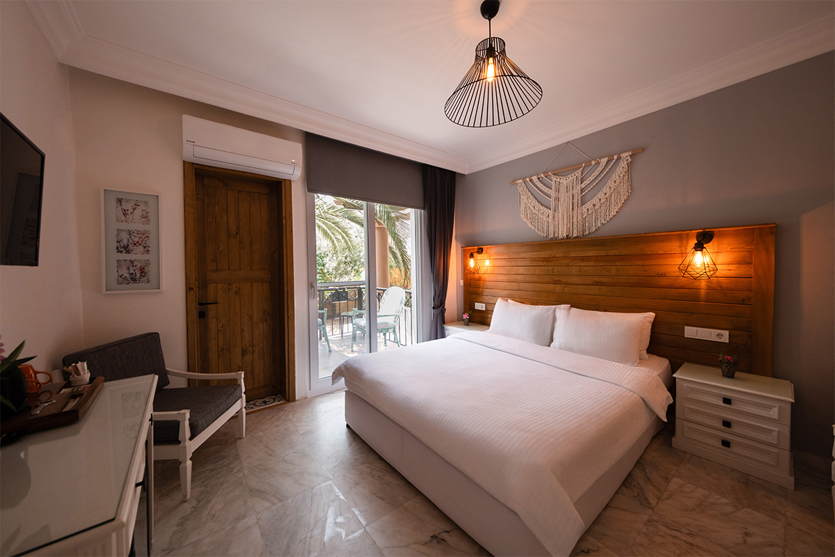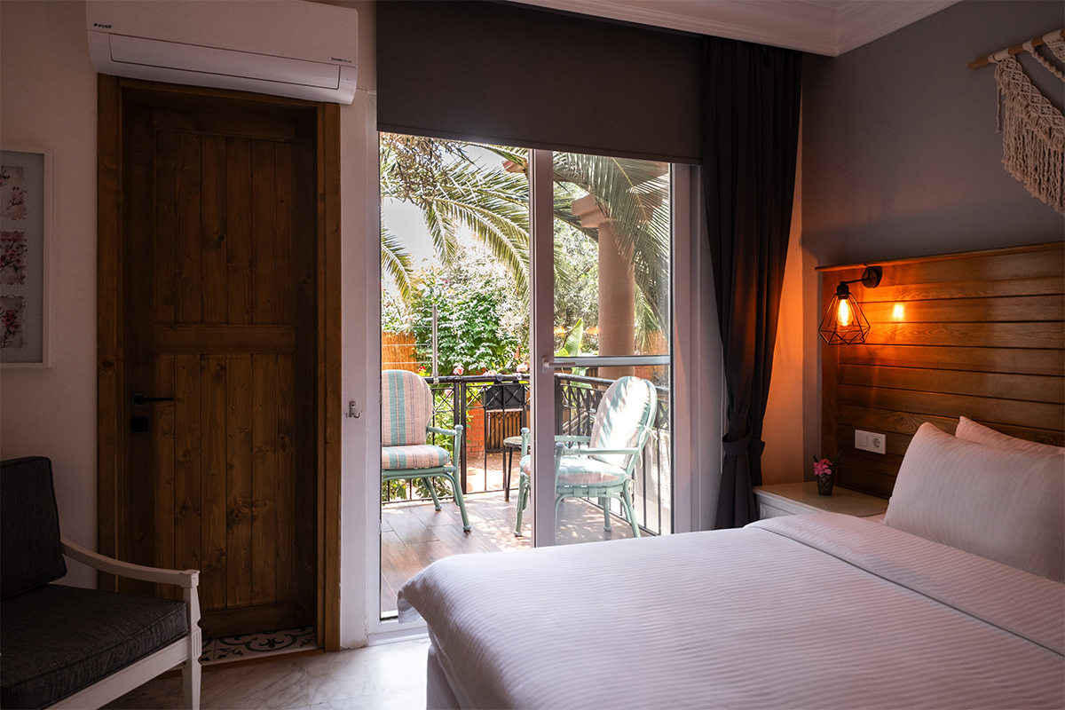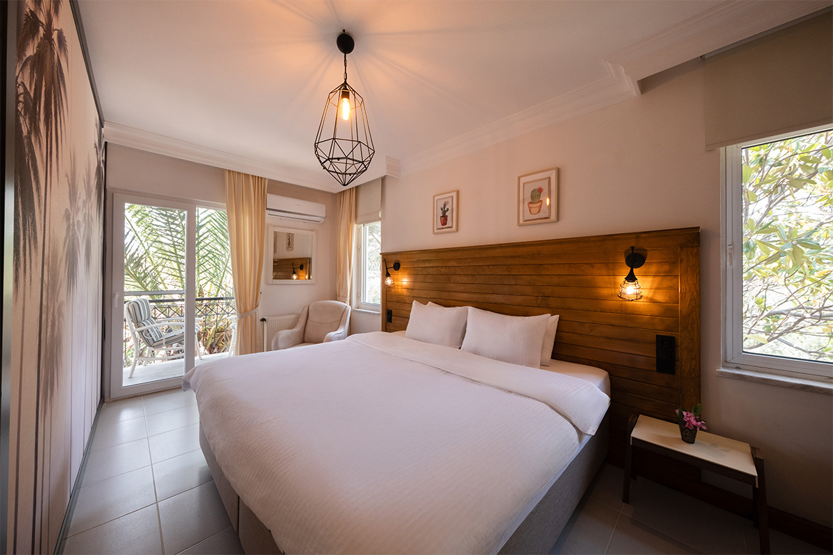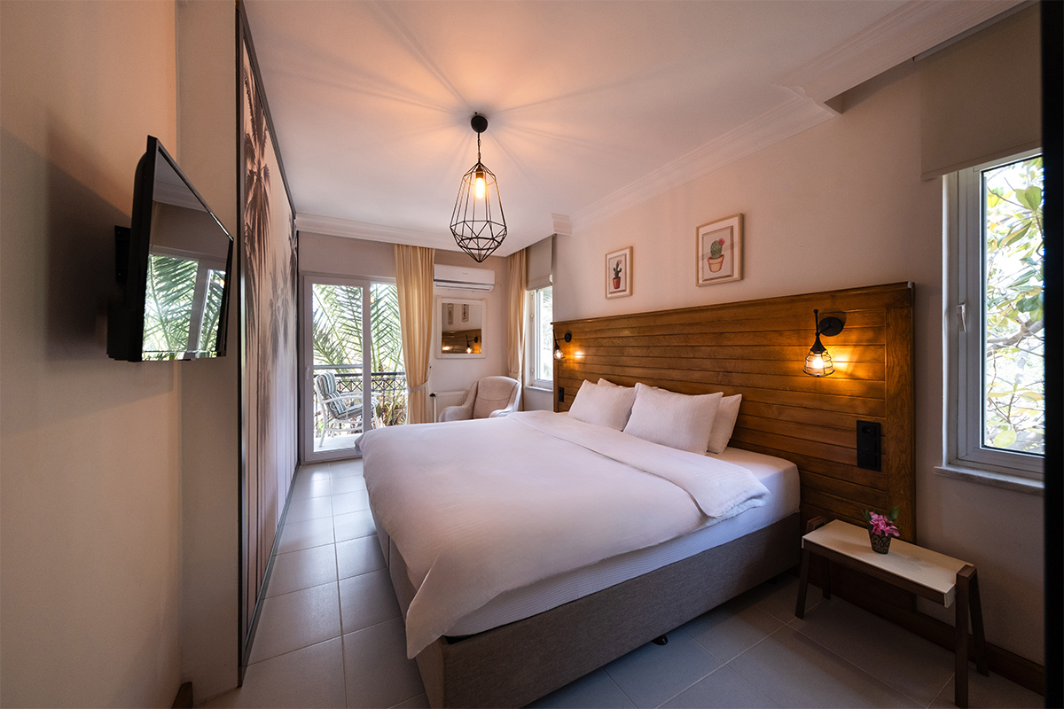 Zeytin ağaçlarıyla çevrili doğal peyzaj manzarası, hem görsel bir huzur sunar hem de konaklama deneyiminizi sakinleştirici bir atmosfere taşır. Balkonlu odalar, özellikle dış mekânda vakit geçirmeyi seven, sabahlarını açık havada karşılamak ya da gün sonunda sessizce dinlenmek isteyen misafirler için uygundur.