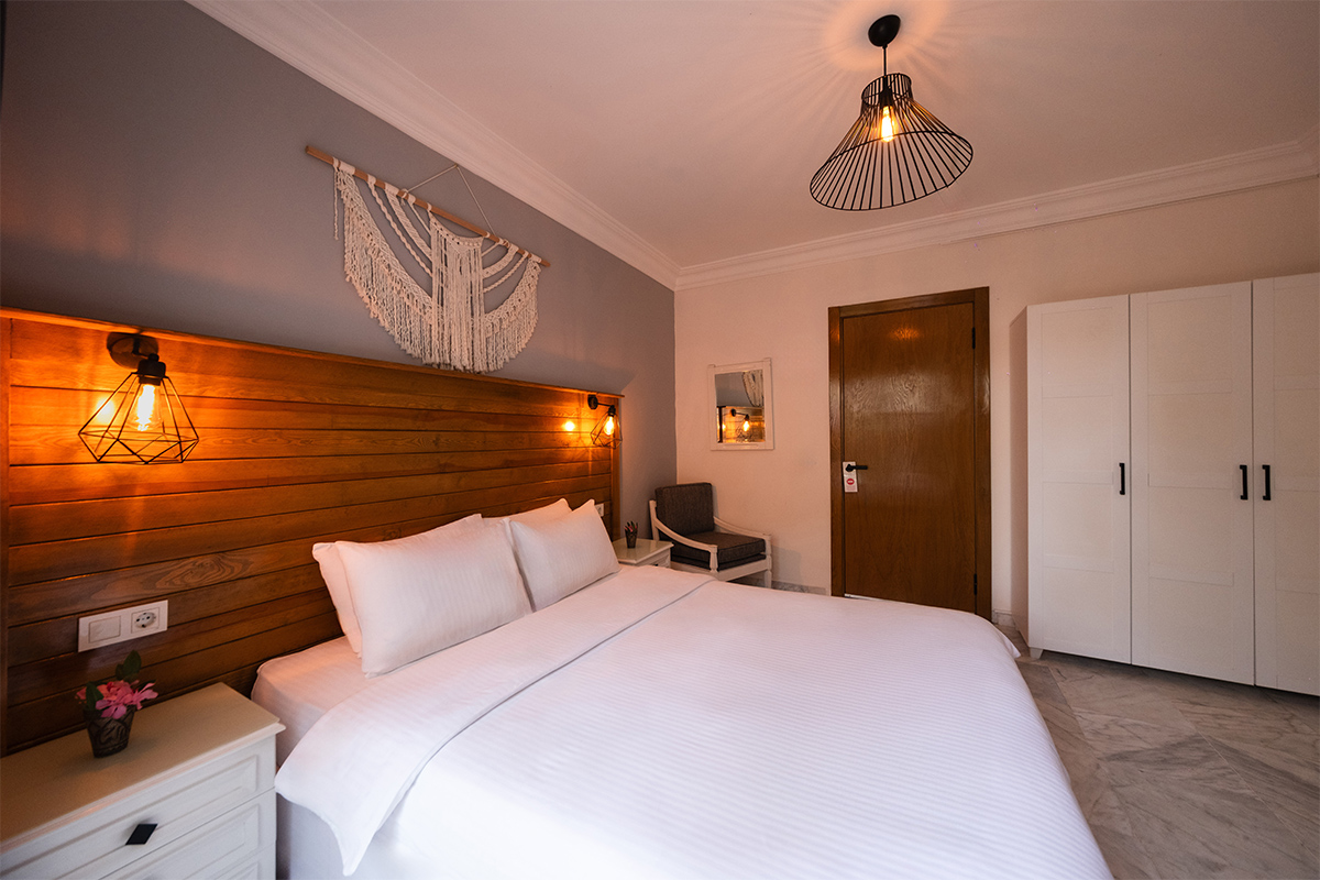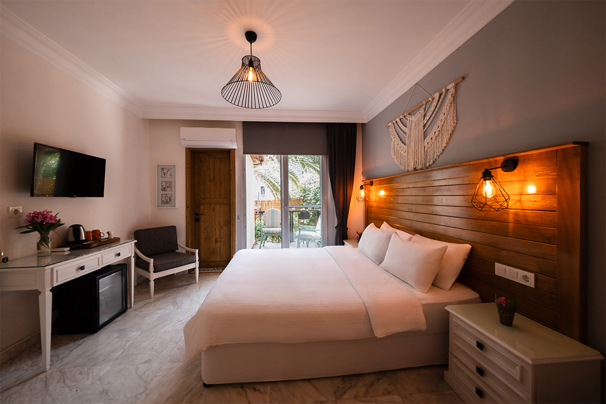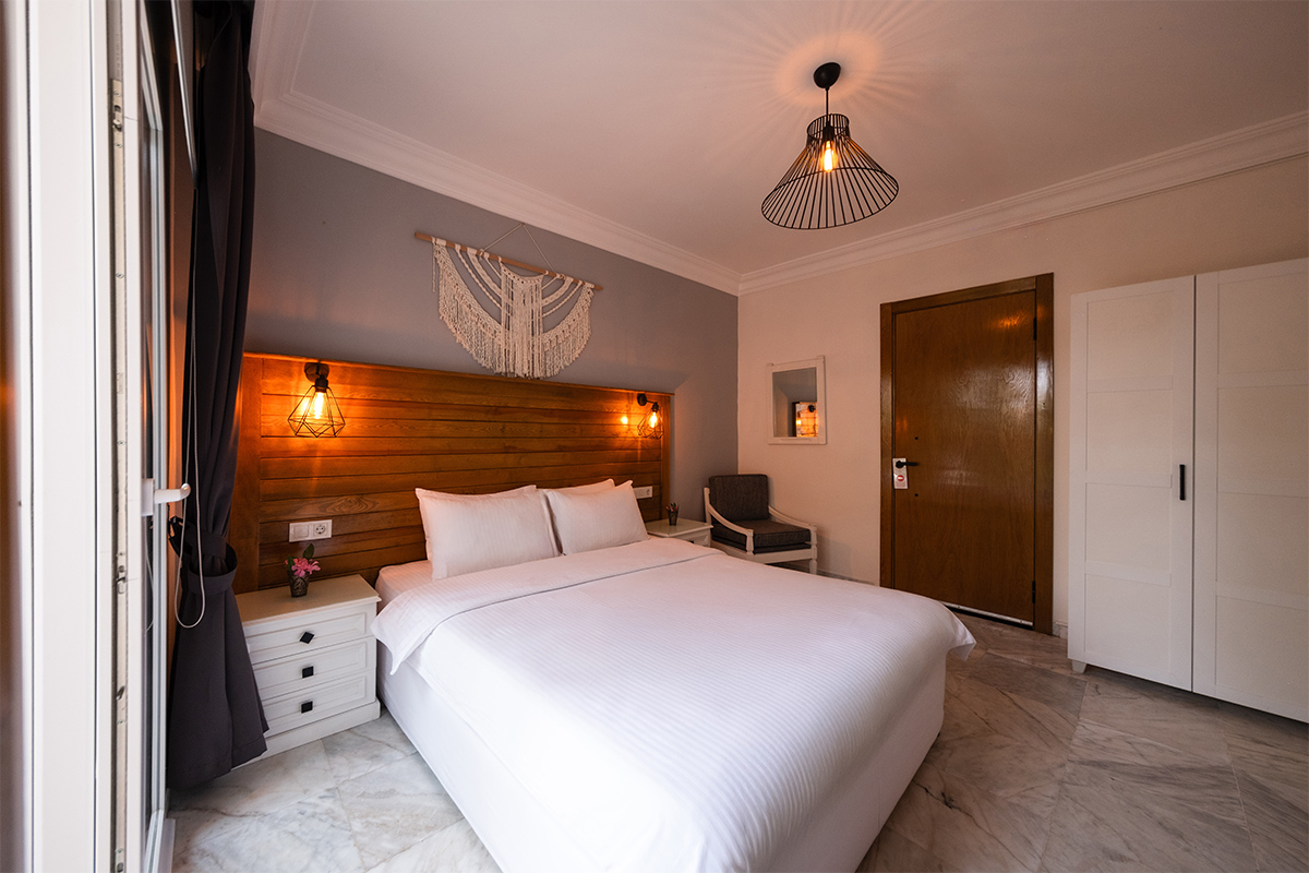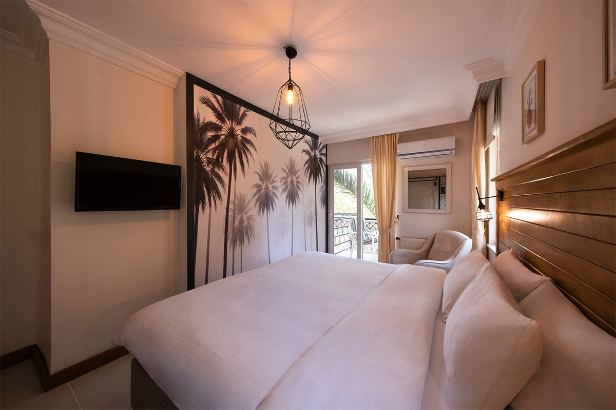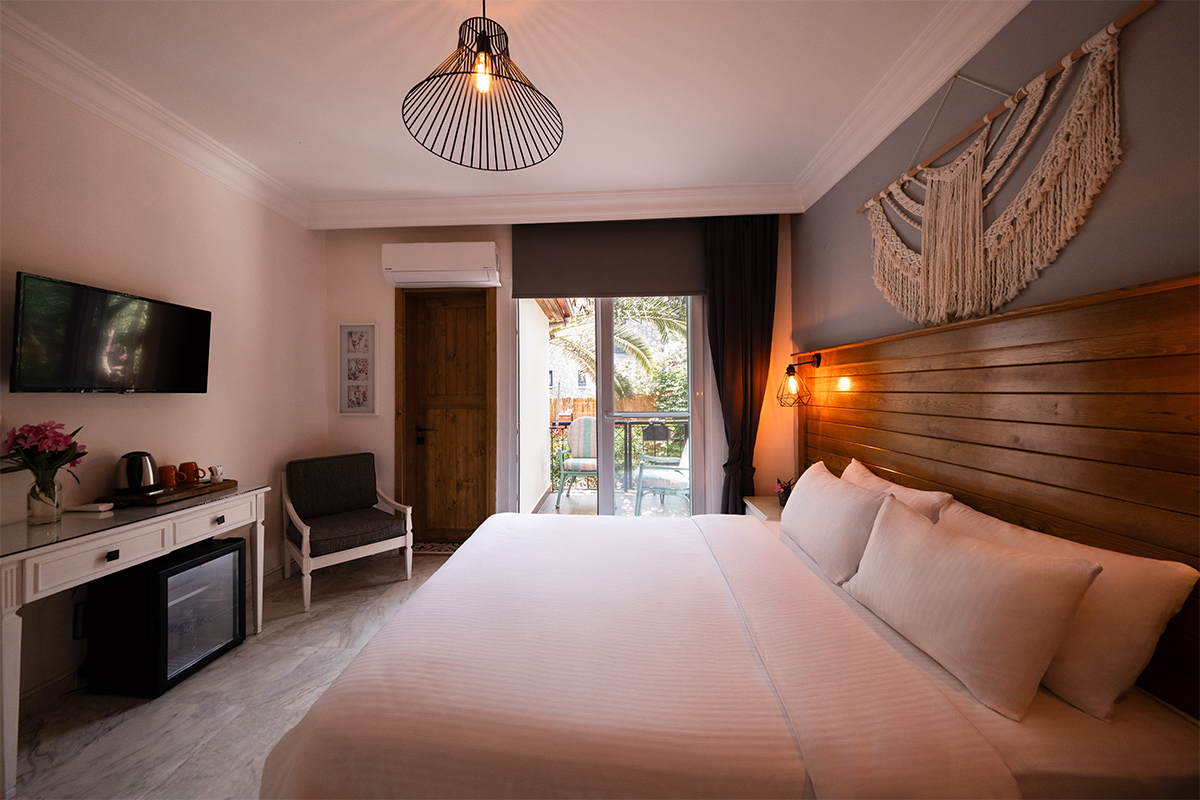 Zeytin ağaçlarıyla çevrili doğal peyzaj manzarası, hem görsel bir huzur sunar hem de konaklama deneyiminizi sakinleştirici bir atmosfere taşır. Balkonlu odalar, özellikle dış mekânda vakit geçirmeyi seven, sabahlarını açık havada karşılamak ya da gün sonunda sessizce dinlenmek isteyen misafirler için uygundur.